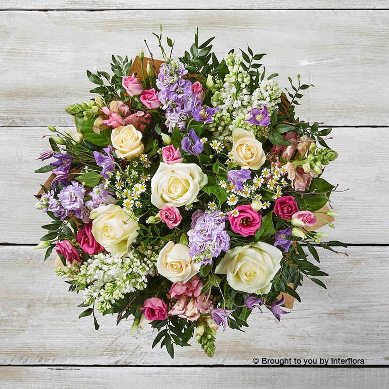 This elegant hand-tied includes pink antirrhinum and lisianthus, purple clematis and lilac stocks, ivory roses and white lilac. Our flower team add natural birch, pistache and salal tips for greenery and texture. We carefully wrap the flowers in kraft paper and tie with branded ribbon for the perfect finishing touch.